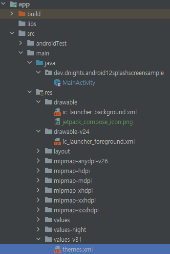 <!-- Customize SplashScreen here. --> <item name="android:windowSplashScreenBackground">@color/purple_700</item> <item name="android:windowSplashScreenAnimatedIcon">@drawable/jetpack_compose_icon</item> <item name="android:windowSplashScreenAnimationDuration">1000</item> <item name="android:windowSplashScreenIconBackgroundColor">@color/teal_700</item> <item name="android:windowSplashScreenBrandingImage">@drawable/ic_launcher_foreground</item>그리고 위와 같이 각 옵션을 추가하여 할당 할 수 있습니다.