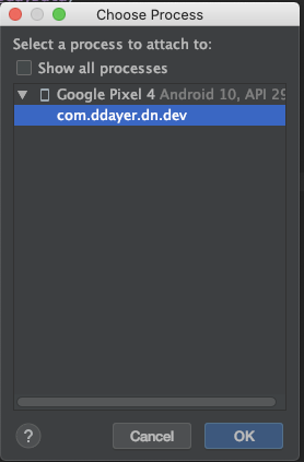 Choose Process 현재 실행중인 앱의 화면 이 표시되며 ViewTree 에서 구조를 볼 수있습니다.