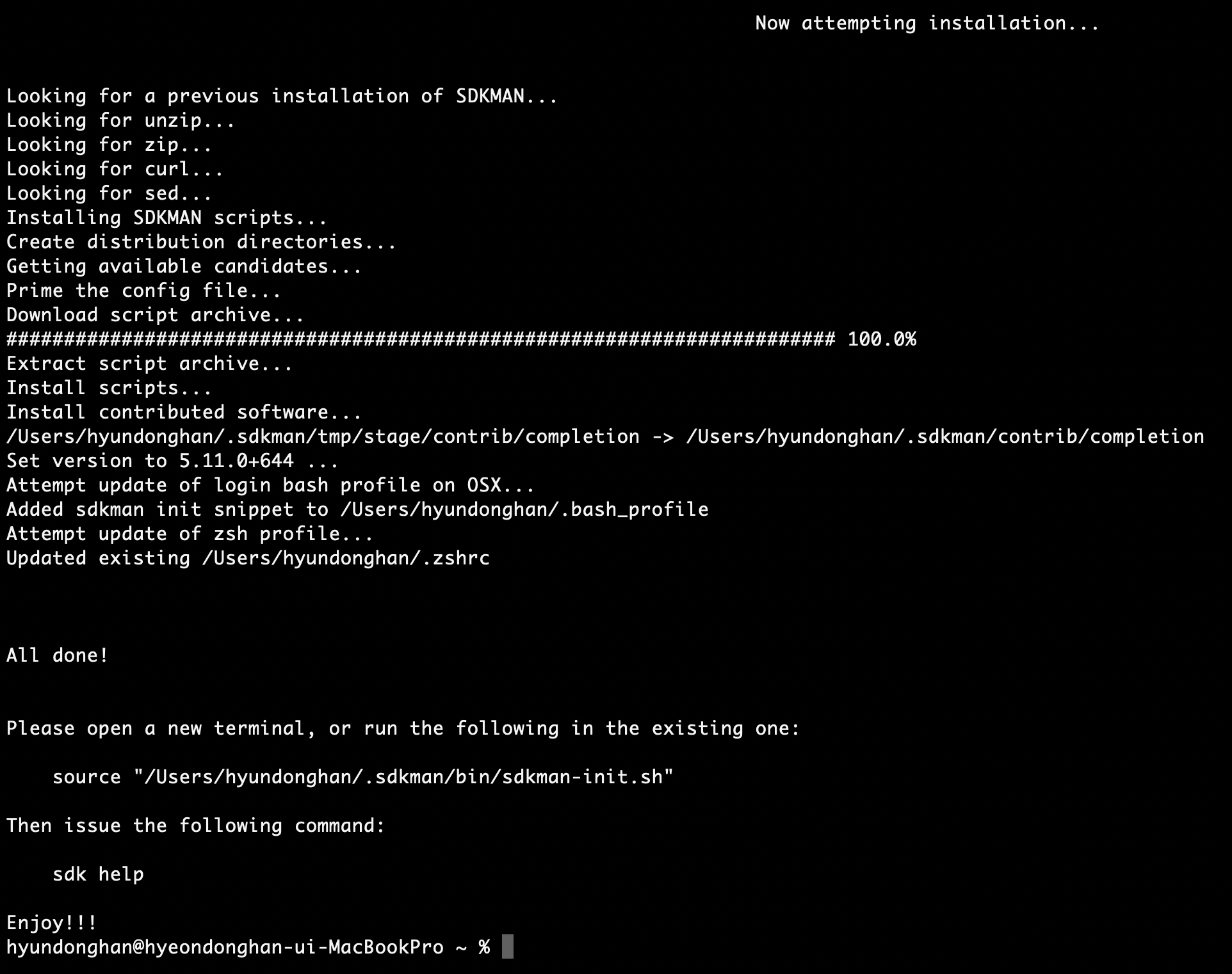아래 명령어를 터미널에 입력하여 sdkman을 설치합니다.