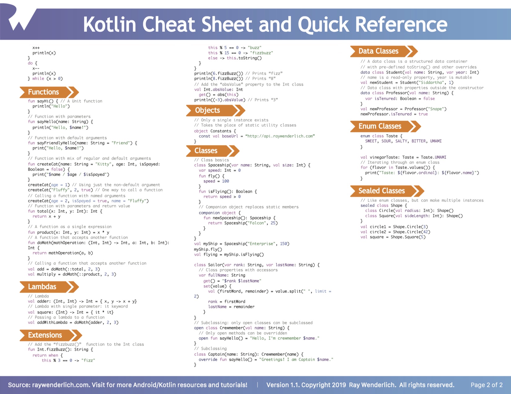 Download a handy 2-page PDF Kotlin Cheat Sheet and Quick Reference!